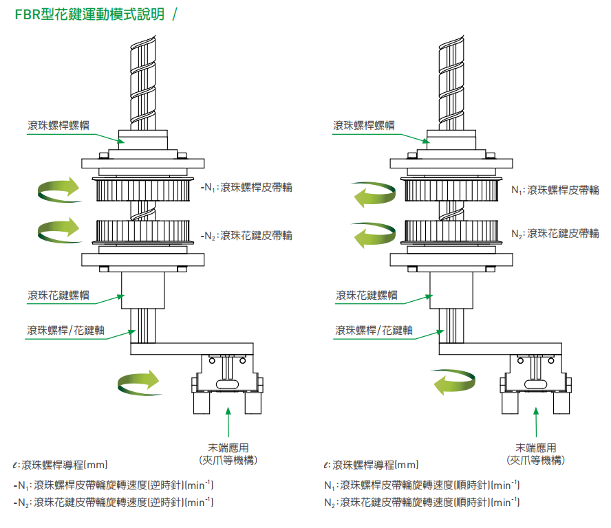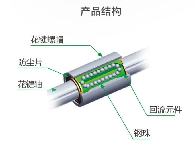 HIWIN滚珠花键为一种滚动导引元件,主要是由螺帽、螺杆、钢珠与保持器所组成,藉由钢珠在螺帽与螺杆之间作无限滚动循环的滚动,使螺帽能沿著螺杆高精度线性移动。滚珠花键上的钢珠为角接触结构,可承受径向负荷及扭矩负荷。螺帽与轴承一体成型设计,使得滚珠花键在精简的结构达到高负载。滚珠花键设置了3组负荷滚珠,滚珠为面对面的角接触设计,滚珠藉由钢珠保持器,持续进行整列循环运动,透过最佳化的保持器设计,实现高速、高加减速的导引,此外保持器对于钢珠的包覆设计使得螺帽从花键轴中抽出,滚珠也不会脱落。
