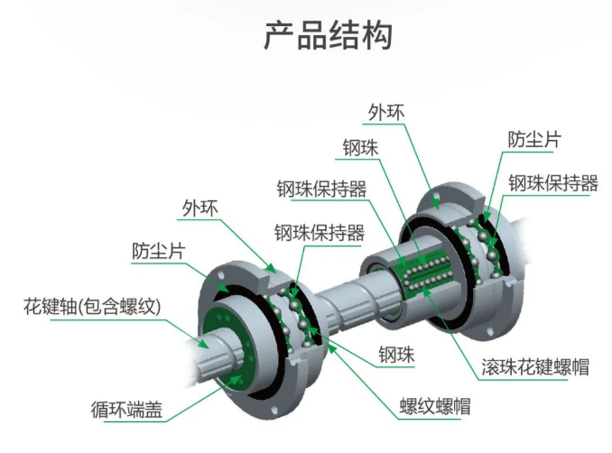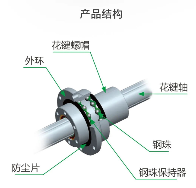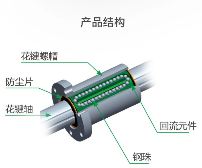 与线性轴承相比,滚动槽中的钢珠为角度接触,因此螺帽与螺杆可以相对运动,达到传递扭矩的功能。