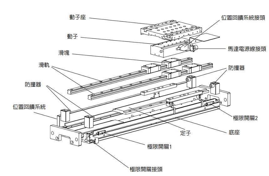直线电机由:动子,动子座,定子,定子座,位置回馈系统,位置回馈系统接头,导轨,防撞器,极限开关,极限开关接头,底座等组成
