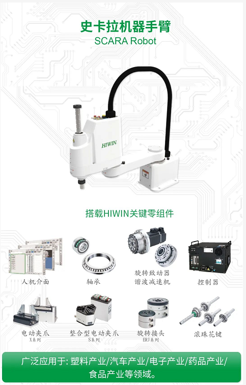使您的设备和制造流程优化, 升级为智能制造, 提升竞争力, 转动商机。 再到模块产品: 旋转致动器、智能型丝杠 & 线轨 i4.0 BS & GW 以及系统件Torque Motor回转工作台和各种工业机器人, 其中包括单轴机器人、6 轴机器人、SCARA 机器人、晶圆机器人和Delta机器人。 应用范围广泛,涵盖汽车、医疗器械、3C/5G产业、金属机床加工、工业机器人及自动化设备与各类精密检测设备…等。 欢迎您莅临上银HIWIN展位:E1-A401参观!